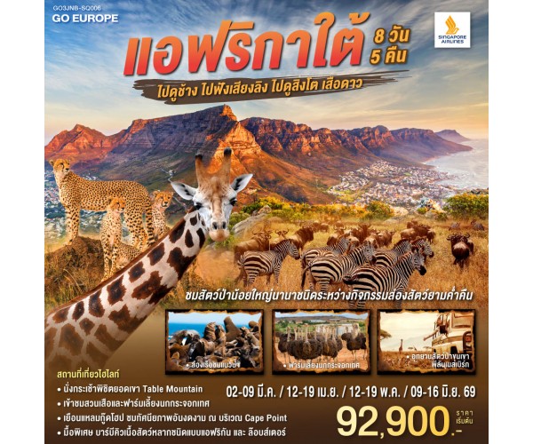 แอฟริกาใต้ ไปดูช้าง ไปฟังเสียงลิง ไปดูสิงโตเสือดาว 8 วัน 5 คืน สายการบิน Singapore Airlines (SQ)