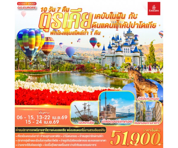 ตุรเคีย เคบับในฝัน กับ ดินแดนถ้ำคัปปาโดเกีย 10 วัน 7 คืน พักโรงแรมสไตล์ถ้ำ 1 คืน โดยสายการบินเอมิเรตส์ (EK)