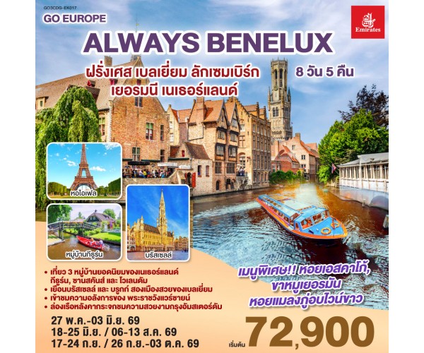 ปารีส – ประตูชัย – หอไอเฟล – ล่องเรือแม่น้ำแซนน์ - ห้างแกลเลอรี่ ลาฟาแยตต์ – พระราชวังแวร์ซายน์ - OUTLET - บรูกก์ – บรัสเซลส์ – ลักเซมเบิร์ก – โคโลญ - มหาวิหารโคโลญ – หมู่บ้านกังหันลมซานสคันส์ - หมู่บ้านประมงโวเลนดัม - อัมสเตอร์ดัม – หมู่บ้านกีธูร์น – ล่องเรือหลังคากระจก - จตุรัสดามสแควร์