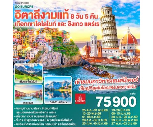 อิตาลีงามแท้ เทือกเขาโดโลไมท์ และ ชิงเกว แตร์เร 8วัน 5คืน โดยสายการบิน Emirates (EK)