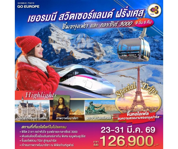 จตุรัสมาเรียนพลาทซ์ - เข้าชมปราสาทนอยชวานสไตน์ - ฟุสเซ่น - ลูเซิร์น - สิงโตหิน - สะพานไม้ชาเปล - อินเทอร์ลาเก้น - สถานีรถไฟจุงเฟรา - ยอดเขาจุงเฟรา - ชมถ้ำน้ำแข็ง - เบิร์น - มองเทรอซ์ - ยอดเขากลาเซียร์ 3000 - โลซานน์ - ศาลาไทย - พิพิธภัณฑ์โอลิมปิค - ดีจอง - ขึ้นรถไฟ TGV สู่ปารีส - เข้าชมพิพิธภัณฑ์ลูฟท์ – ประตูชัยนโปเลียน - ขึ้นหอไอเฟล ชั้น 2 ปารีส - เข้าชมพระราชวังแวร์ซายน์ - ล่องเรือแม่น้ำแซน - ห้างแกลลอลี่ลาฟาแยทท์