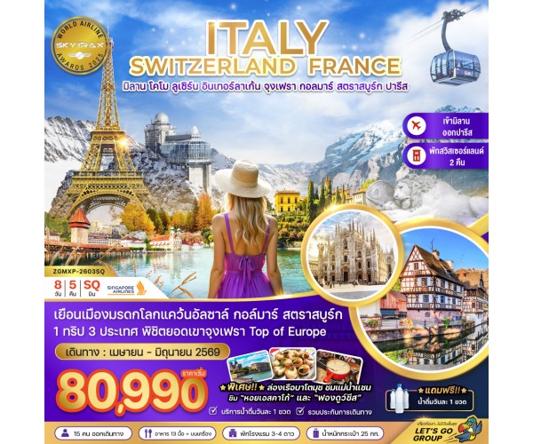 ชื่อโปรแกรม : อิตาลี สวิส ฝรั่งเศส (จุงเฟรา กอล์มา สตาร์สบูร์ก) (8 วัน 5 คืน)