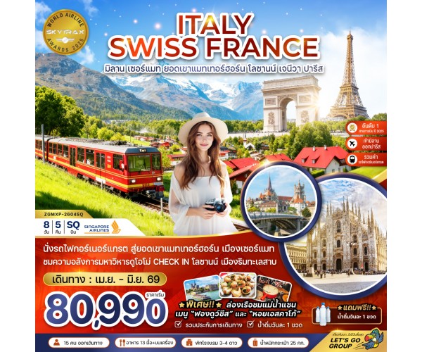 ชื่อโปรแกรม : อิตาลี สวิส ฝรั่งเศส (มิลาน เซอร์แมท ยอดเขาแมทเทอร์ฮอร์น โลซานน์ เจนีวา ปารีส) (8 วัน 5 คืน)
