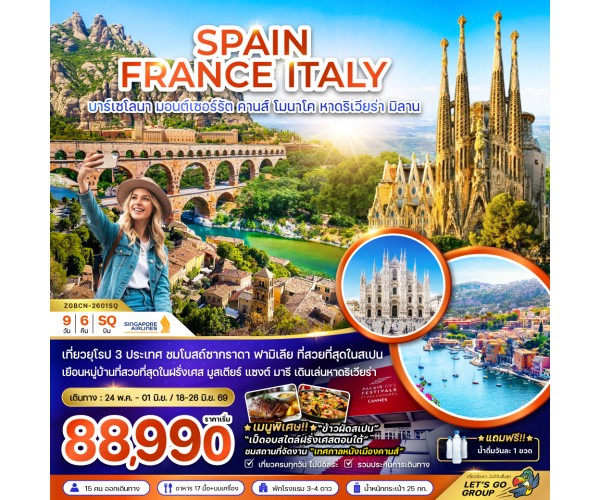 ชื่อโปรแกรม : สเปน ฝรั่งเศส อิตาลี (บาร์เซโลนา คานส์ หาดริเวียร่า มิลาน) (9 วัน 6 คืน)