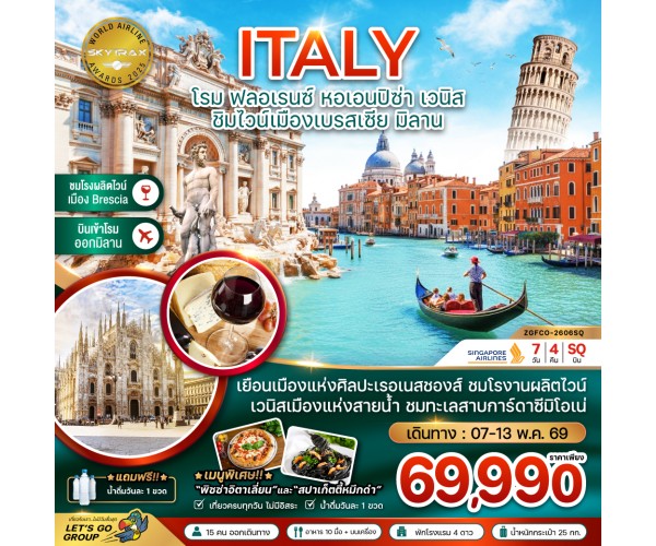 ชื่อโปรแกรม : อิตาลี (โรม ฟลอเรนซ์ หอเอนปิซ่า ชิมไวน์เมืองเบรสเซีย มิลาน) (7 วัน 4 คืน)