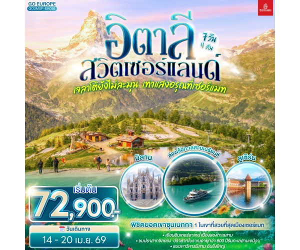 มิลาน - ลูเซิร์น - ซูริค - ซุก -ล่องเรือทะเลสาบเบรียนซ- อินเทอร์ลาเก้น - เบิร์น - กรุยแยร์ - มองเทอรซ์ - ปราสาทชิลยอง - ซียง - เซอร์แมท - นั่งรถรางสู่ยอดเขาซุนเนกก้า - ตูริน - Serravalle designer outlet - มิลาน- มิลานดูโอโม