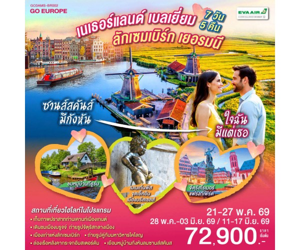 รอตเทอร์ดาม – บรูกก์ - โบสถ์พระโลหิตศักดิ์สิทธิ์ - เกนท์ - ถ่ายรูปปราสาทท่านเคานท์ - บรัสเซลส์ - จัตุรัสแกรนด์เพลส – ลักเซมเบิร์ก – แฟรงก์เฟิร์ต - จัตุรัสโรเมอร์ - ศาลาว่าการ - ถนนช้อปปิ้งซายล์ - โคโลญ - มหาวิหารโคโลญ – ช้อปปิ้งโรมอนด์เอ๊าท์เล็ต - ล่องเรือชมหมู่บ้านกีธูร์น -อัมสเตอร์ดัม - ย่านโคมแดง – จัตุรัสดามสแควร์ - ล่องเรือหลังคากระจก - โรงงานเจียระไนเพชร – หมู่บ้านกังหันลมซานส์สคันส์